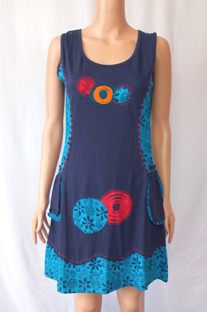 This is a summer 100% cotton dress and has beautiful circle patches on the front side.