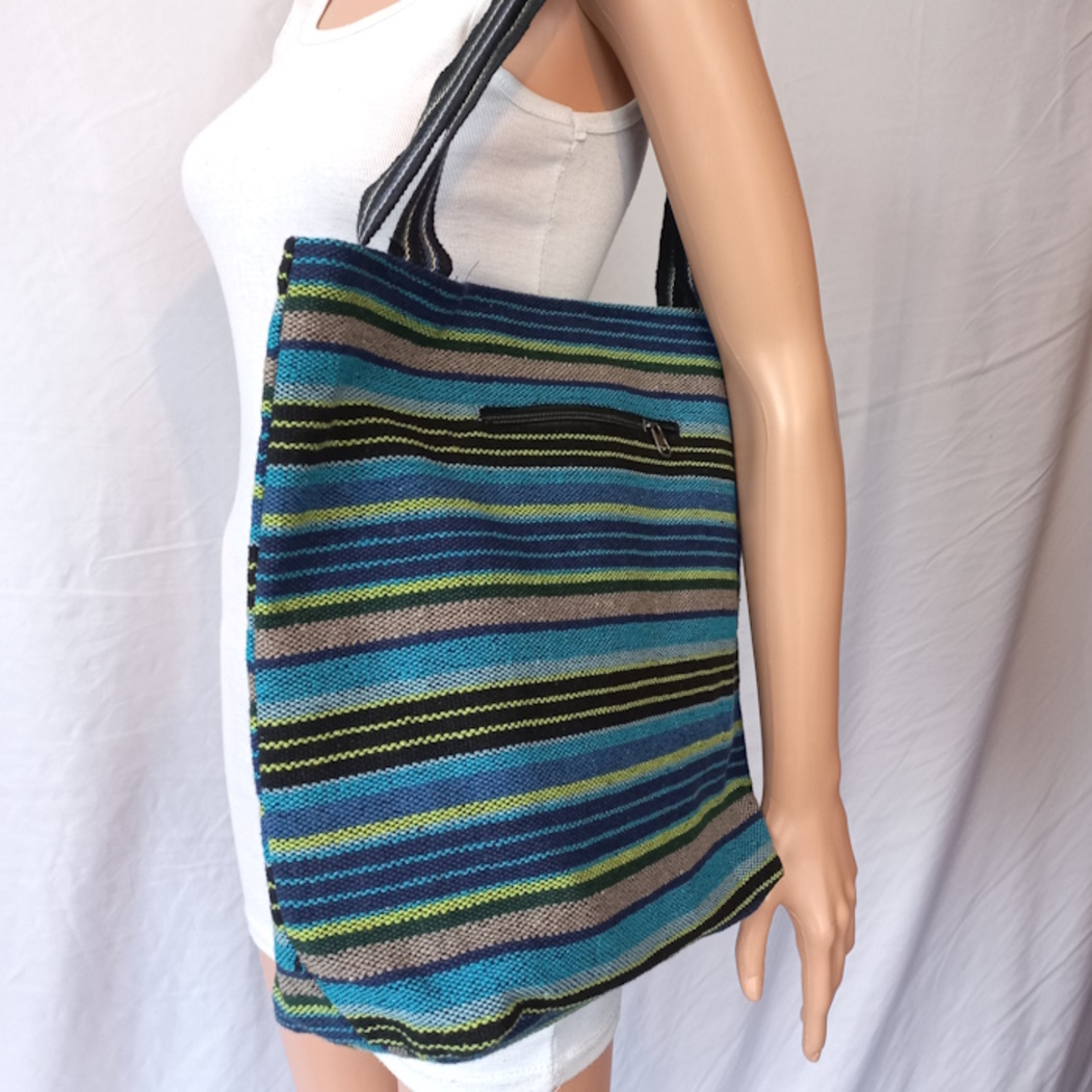 A thick handwoven 100% cotton bag.