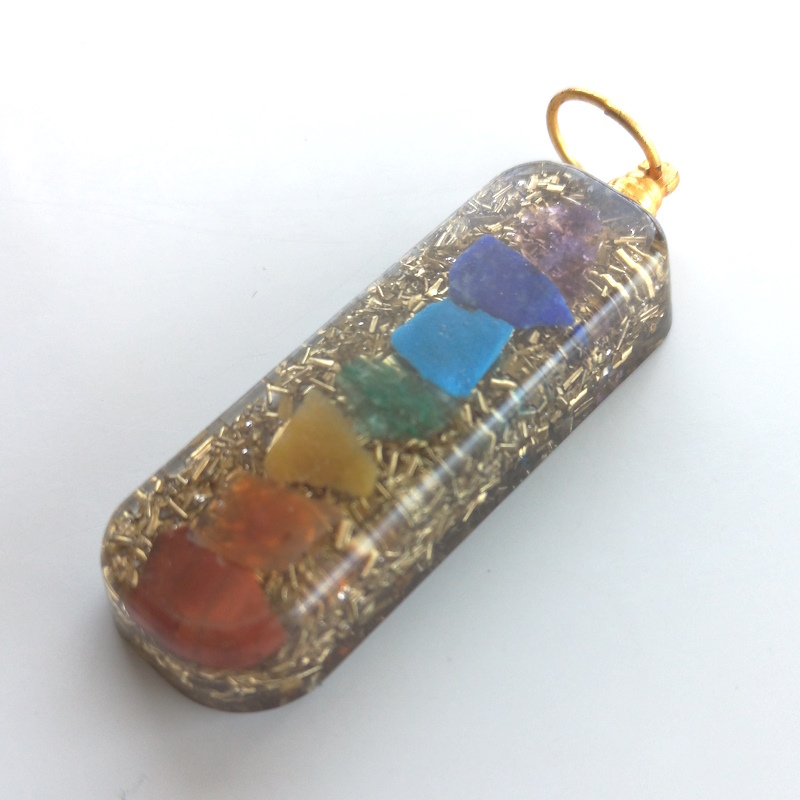 Flat orgonite pendant with 7 Chakra Stones chips and copper.
