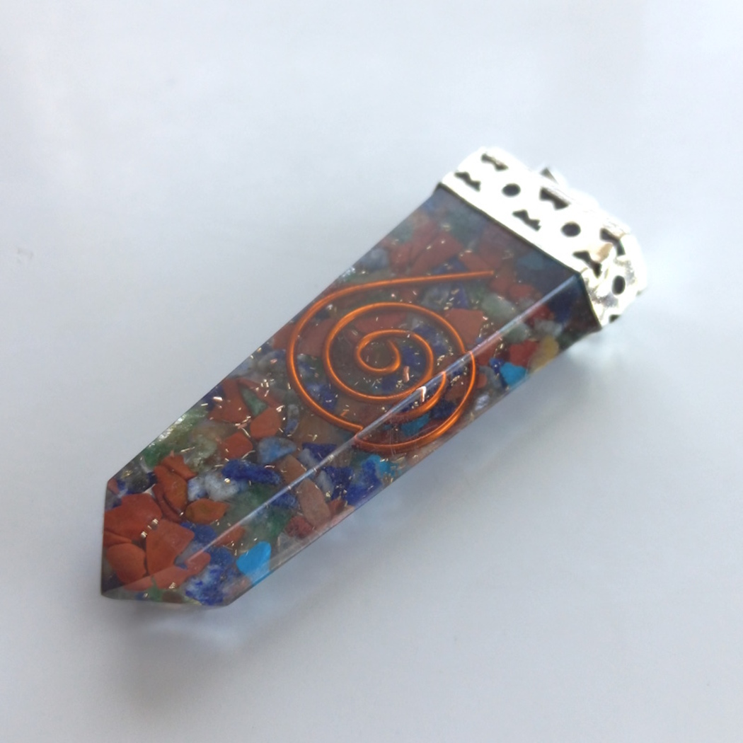 7 Chakra Stones filled Orgonite Pendants with a crystal coil in the center.