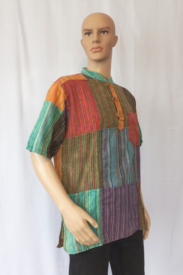 Stonewashed patchwork 100% cotton short sleeve shirt.