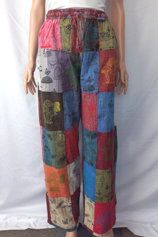 Stonewashed, 100% cotton pants with mushrooms printed on.