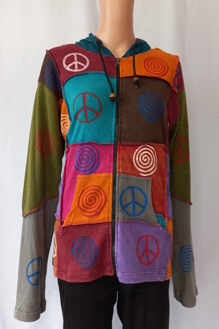 Colourful patch-work of razor cutting designs of peace and spiral ribbed cotton hooded jacket.