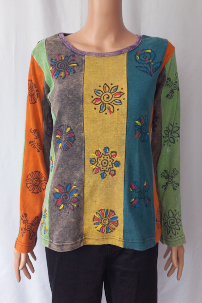 This cotton long sleeve top has block prints and is hand painted.