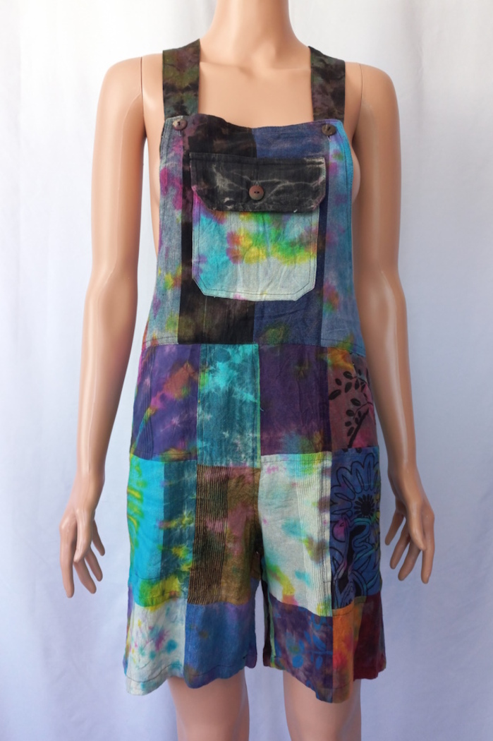 Stonewashed, patchwork, 100% cotton half dungarees.