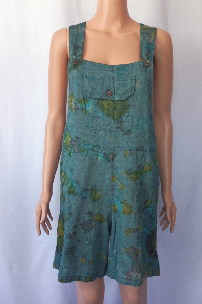 100% cotton short jumpsuits with two pockets and wooden button system at the sides and top for adjustment.